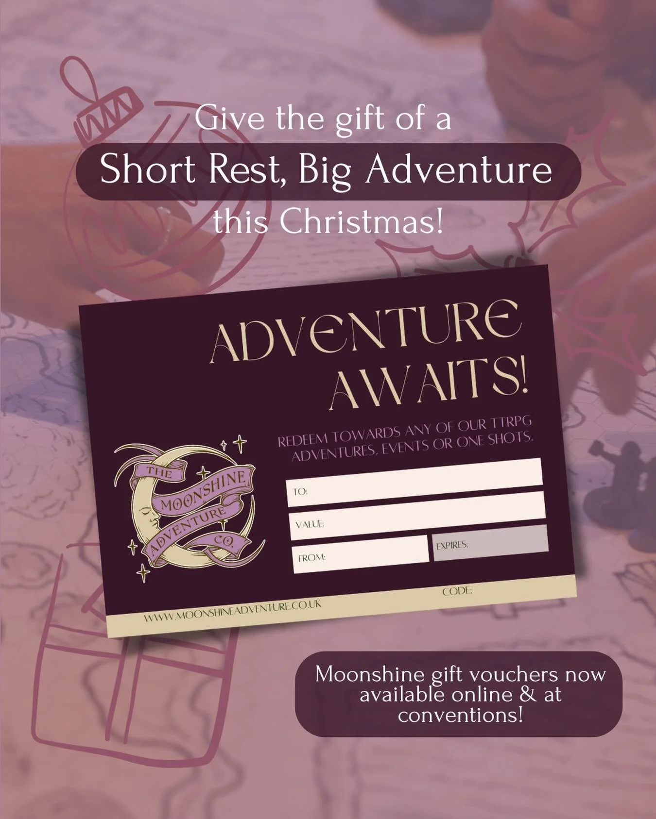 Looking for the perfect Christmas present for your favourite Game Master or TTRPG companion? Buy them a Moonshine gift card which they can use to join one of our one-shots, Adventures or to design one of their own…